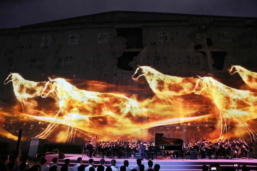 音乐会则通过精心编排的曲目与光影叙事交相辉映,用经典诠释伟大抗战精神。吕其明大师的传世经典之作《红旗颂》(60周年纪念版)恢弘开篇,激昂旋律中,西墙光影红旗飘扬、星火汇聚,致敬先辈的热血与担当;交响诗《铁道游击队》选段,以音乐为叙事脉络,构建“潜行”“激战”“曙光”三幕具有戏剧张力的光影背景,唤起银幕内外的共同记忆;殷承宗、储望华、刘庄、盛礼洪根据作曲家冼星海的《黄河大合唱》改编而成的钢琴协奏曲《黄河》第二、四乐章,浓缩民族气魄;《黄河颂》以水墨风格呈现奔腾山河;《保卫黄河》则以奔马为核心,千军万马踏浪穿越硝烟,描绘一幅不屈不挠的壮阔画卷;西墙上以“缅怀”“希望”“和平”“胜利”四类花卉意象串联,此时,交响曲《光芒》第三乐章奏响,澎湃乐音展现新时代中华儿女接续奋斗、共筑民族复兴伟梦的磅礴力量。