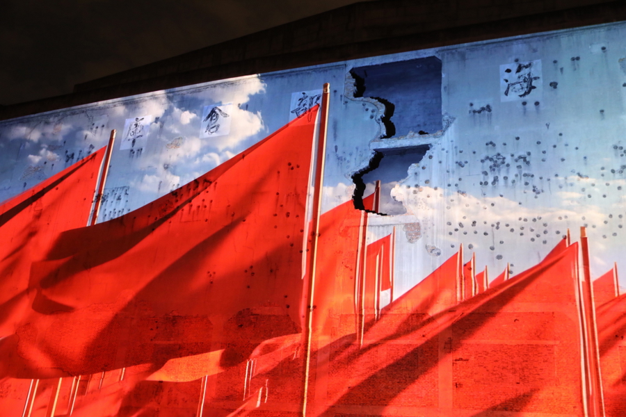 傍晚7时,天色渐暗。苏州河畔,上海四行仓库抗战纪念馆静静矗立。宛如红色旗帜飘扬般的流动光影攀上弹痕斑驳的西墙,“铭记历史 缅怀先烈 珍爱和平 开创未来”的金色大字渐渐浮现眼前,与建筑融为一体。9月3日,静安区纪念中国人民抗日战争暨世界反法西斯战争胜利80周年主题光影音乐会在此拉开帷幕。