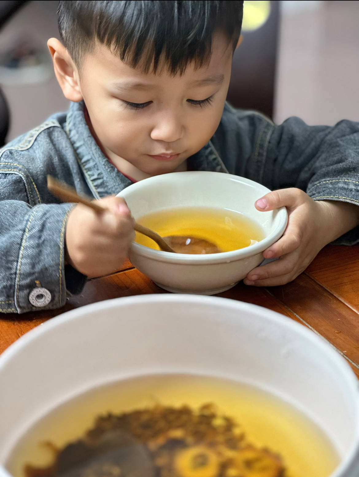 第一天,他还有点抗拒,觉得味道有点怪。后来再煮就加点冰糖,慢慢也就接受了。