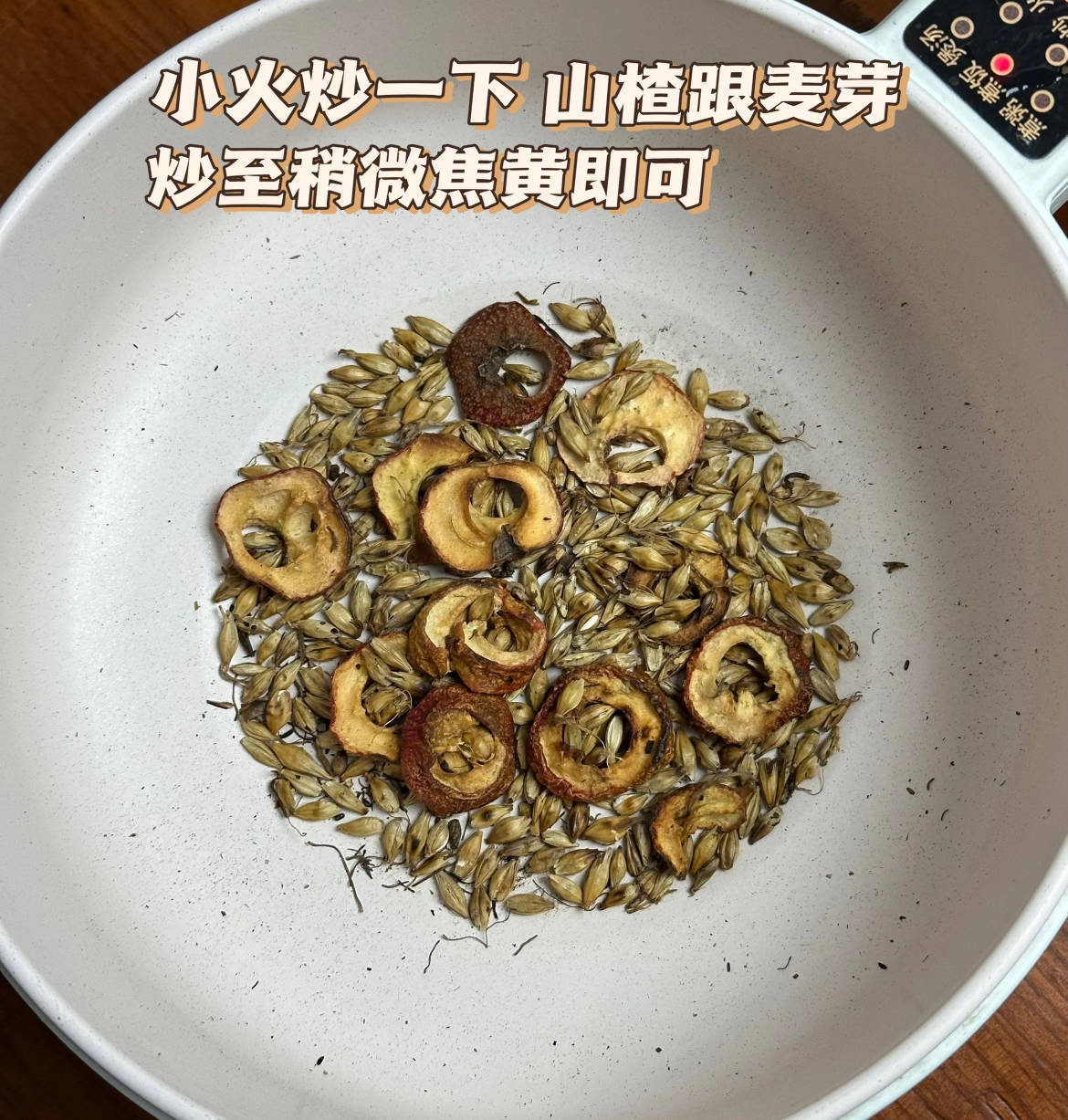 1、将山楂和麦芽放入锅中,用小火慢慢翻炒,炒至食材表面呈现焦黄色,散发出香气即可。