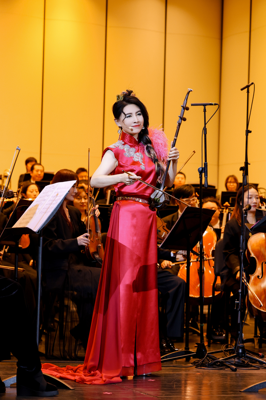 上半场,《命运—〈江河水〉》《引子、吟唱与快板》《天山牧羊女》都是作曲家杨立青为马晓辉量身打造的作品。《命运—〈江河水〉》取材于东北民间乐曲《江河水》,1990年,马晓辉与中国交响乐团首演此曲后,这首作品便成为她将二胡推向国际舞台的里程碑。
